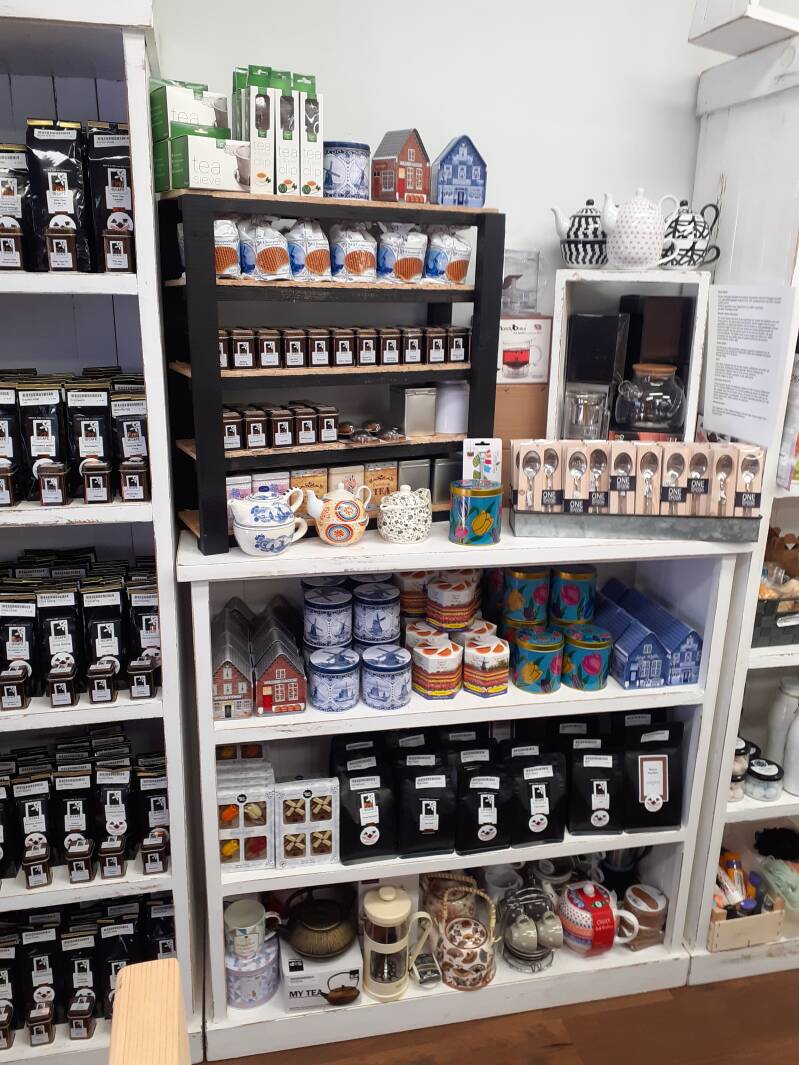 Wat wij hebben staan zijn 66 soorten losse thee, koffiebonen, thee accessoires, leuke metalen en houten doosjes met stroopwafels, huisjes van metaal met Oud Hollands snoep, theelepels met een leuke tekst er op en nog veel meer...........cadeau artikelen.